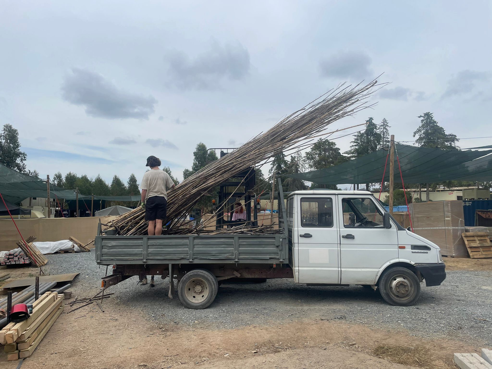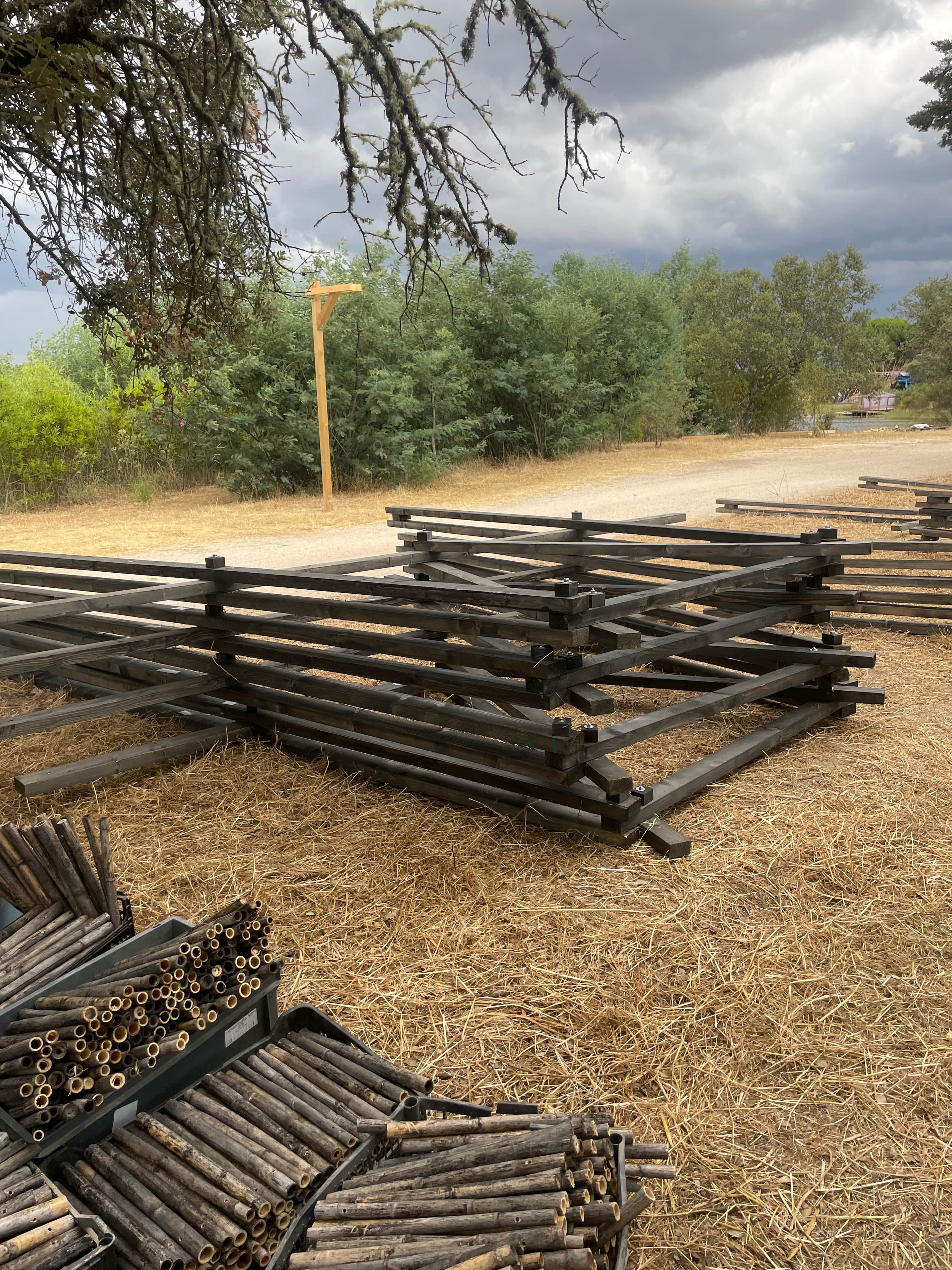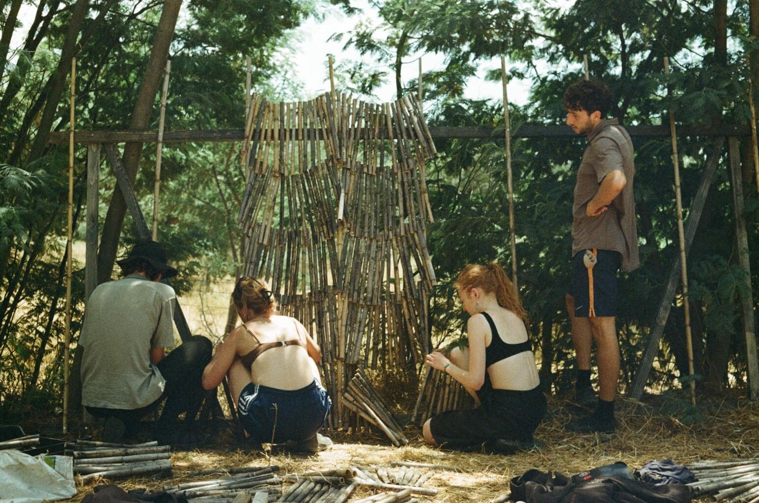 The carpentry by the lake served as a hands-on teaching experience in experimental timber construction. Participants began by installing a pontoon with timber legs anchored in the mud, then built up a working deck using beams, joists, and decking. Once the platform was established, timber frames were positioned and braced, allowing work to continue on the shading panels. Emphasising sustainable design, the team reused waste canes found on site, cutting, drilling, and threading nearly 2,000 short pieces to form a splayed shading system. Dead canes from a nearby bamboo grove were incorporated into a second structure, with both shading panels providing functional bracing for the timber frames while demonstrating circular construction techniques.