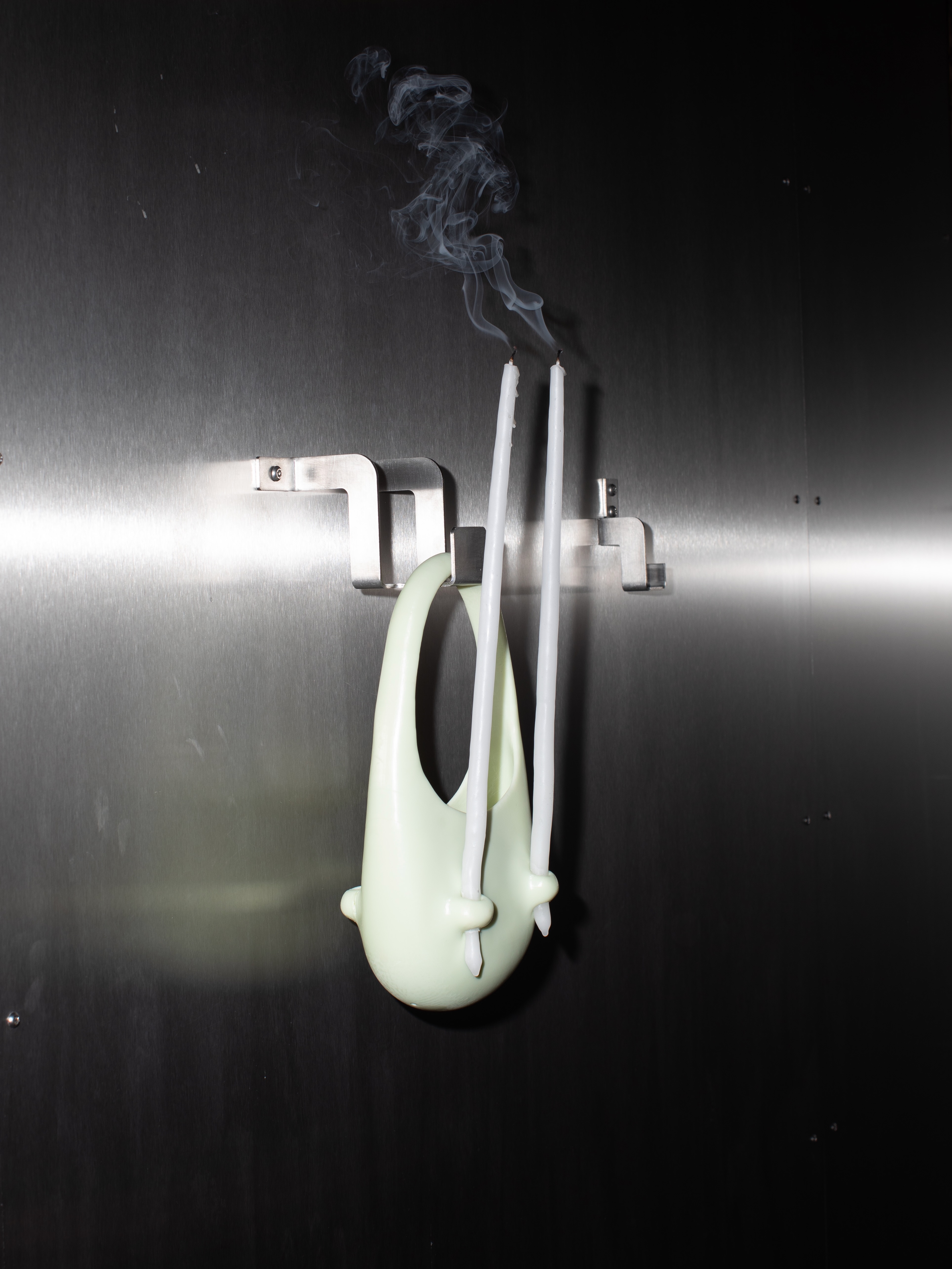 This piece revisits the Swipe Bag as a candle holder, transforming its function and symbolism. Installed in the changing room of Vitruta, it becomes a site-specific offering to slowness, maintenance, and the impossibility of keeping anything intact. A vessel - not for carrying, but for posing.