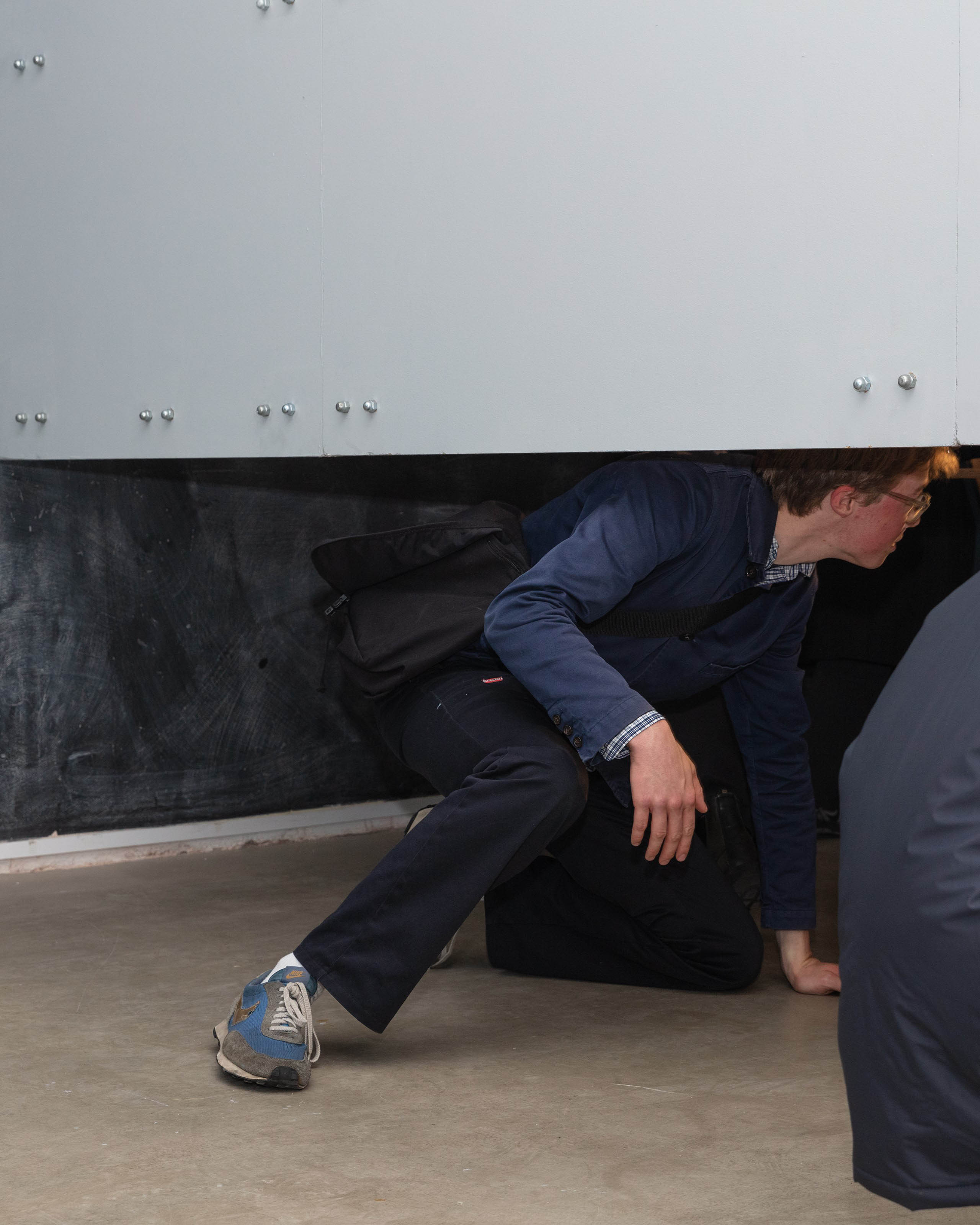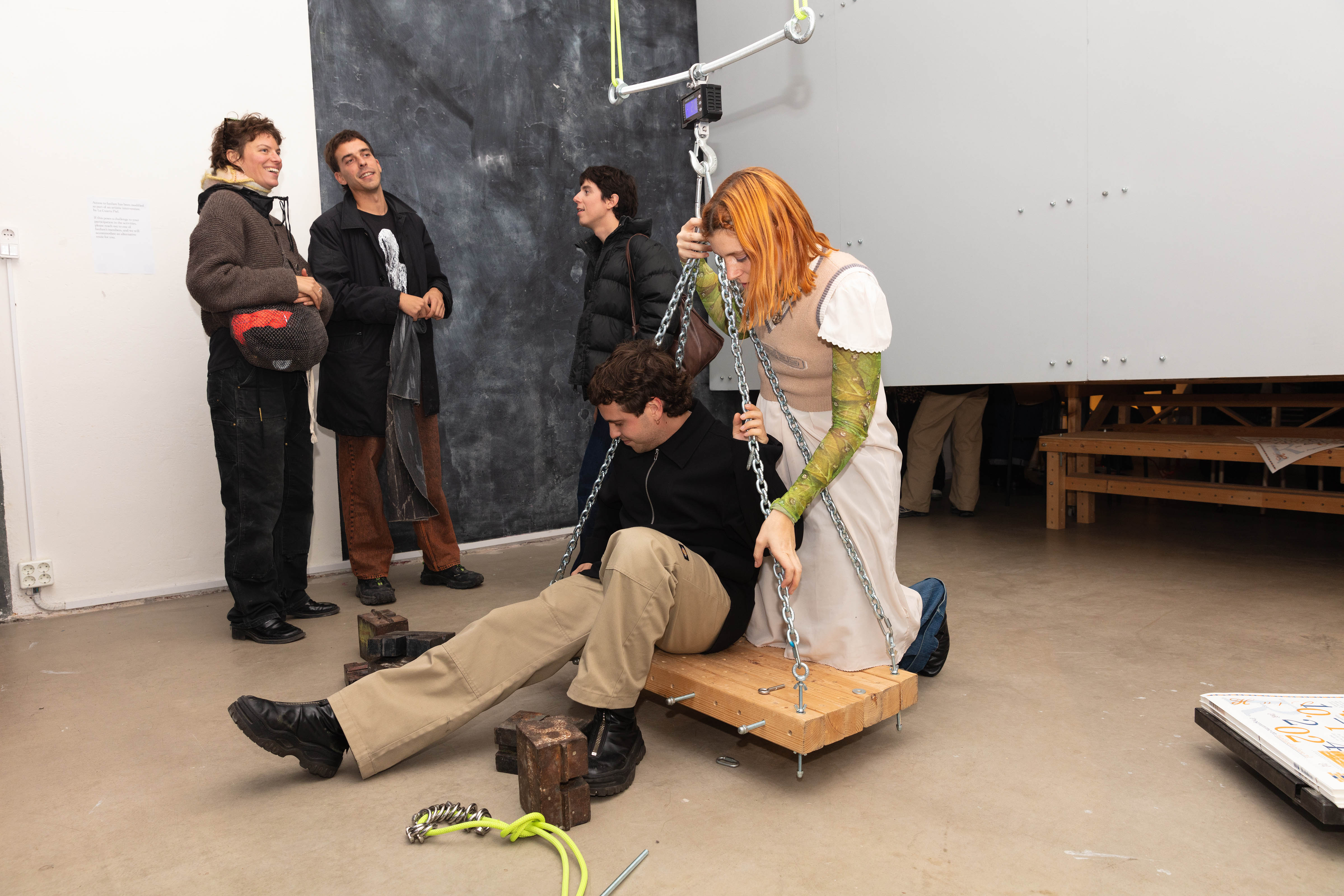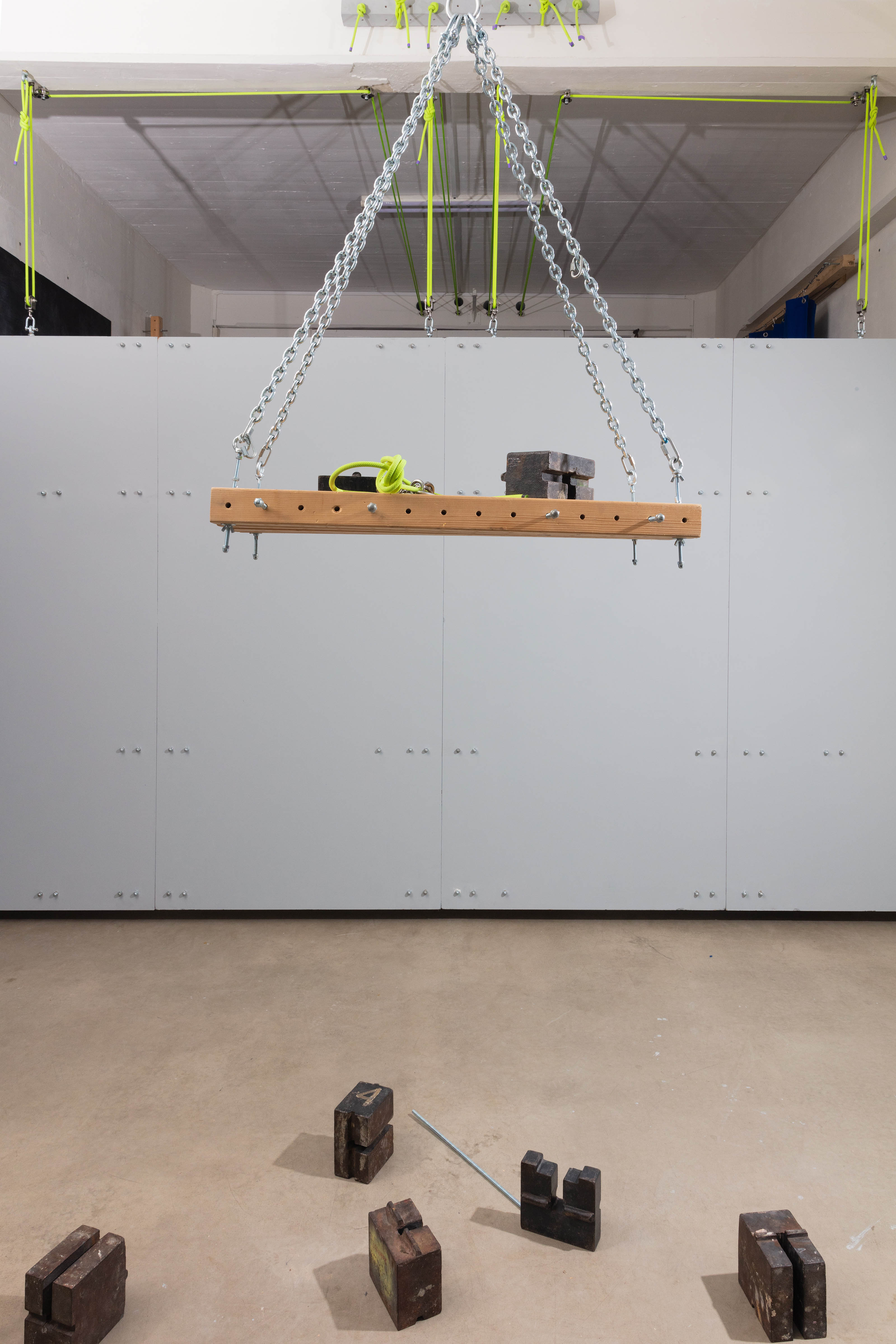 A site-specific intervention on balance, locks, and sluices for Fanfare Amsterdam. A system of ropes and pulleys runs through the structure of the Tetterode building to activate a large lift-gate that divides and obstructs the space. We Transfer is both an installation and an artistic residency within the Broken Channels research programme, where we explore landscapes and mechanisms related to the notion of LOCK & UNLOCK.